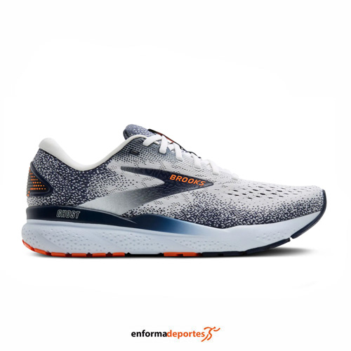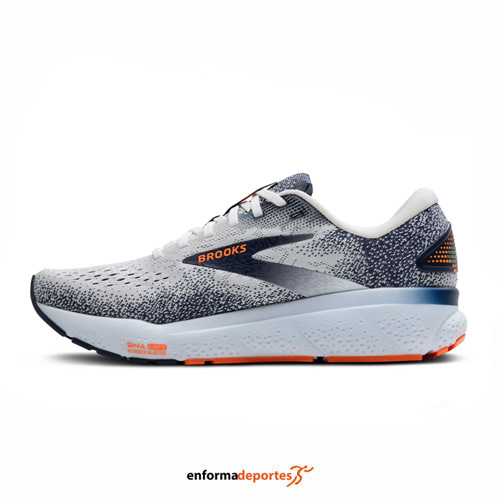 Zapatilla hombre BROOKS GHOST 16, ideal para corredoras que buscan comodidad y soporte, confeccionada en su parte superior de malla para mayor transpirabilidad y un mejor ajuste, con excelente amortiguación gracias a la tecnología DNA LOFT v3 que proporciona una pisada suave y receptiva, con cierre con cordones, con talón acolchado y con suela con Crash Pad segmentado, que asegura transiciones suaves y fluidas durante la carrera.
