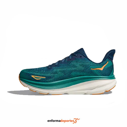 Zapatilla hombre HOKA CLIFTON 9, de pisada neutra, indicadas para medias y largas distancias, con empeine textil de punto técnico transpirable ofrece un ajuste ceñido y más adaptado al pie para unas sensaciones más agradables, con mediasuela para hacerla 3 mm. más alta, con diseño y silueta sin costuras que reduce las rozaduras y fricciones que pueden generar la aparición de ampollas, mediasuela Soft EVA extra suave y con un 30 % más amortiguación que la EVA tradicional. Su diseño Meta-Rocker en fase inicial, con efecto balancín, proporciona movimientos fluidos que incrementan el dinamismo de la carrera y suela de caucho Durabrasion Rubber™ colocado de forma estratégica para más tracción y durabilidad. El diseño Full Ground Contact ofrede flexibilidad y una suave transición talón-puntera.