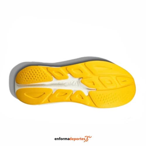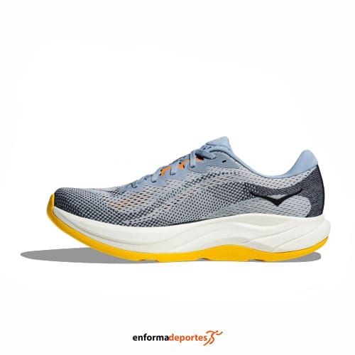 Zapatilla hombre HOKA RINCON 4, de pisada neutra,  fabricada en su parte superior de tejido malla Jacquard técnico doble de una sola capa para mayor transpirabilidad, amortiguación baja, con lengüeta acolchada que permite calzarse la zapatilla con facilidad y comodidad, entresuela  de dos capas de EVA con compresión completa, que proporciona la amortiguación exclusiva de HOKA, con estructura Active Foot Frame™ centrada en la parte trasera del pie, MetaRocker™ suave y suela exterior de estructura podular de EVA vulcanizada.