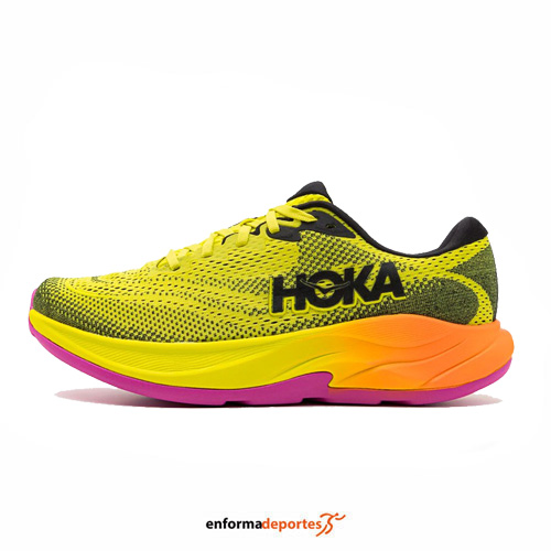 Zapatilla hombre HOKA RINCON 4, de pisada neutra, fabricada en su parte superior de tejido malla Jacquard técnico doble de una sola capa para mayor transpirabilidad, amortiguación baja, con lengüeta acolchada que permite calzarse la zapatilla con facilidad y comodidad, entresuela de dos capas de EVA con compresión completa, que proporciona la amortiguación exclusiva de HOKA, con estructura Active Foot Frame™ centrada en la parte trasera del pie, MetaRocker™ suave y suela exterior de estructura podular de EVA vulcanizada.