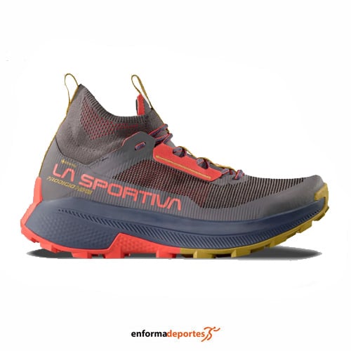 Zapatilla hombre LA SPORTIVA PRODIGIO HIKE GTX, con parte exterior fabricado en malla de alta tenacidad, aporta una amortiguación y transpirabilidad excepcionales, con membrana GORE-TEX ePE Extended Comfort mantendrá el pie seco en todo momento, con talón ergonómico con goma protectora que aporta un excelente punto de apoyo, mientras que el innovador ribete del cuello envuelve el tobillo para proporcionar estabilidad extra, con suela FriXion Red te brindará el agarre y goma protectora en la puntera que protege el pie de piedras y raíces.