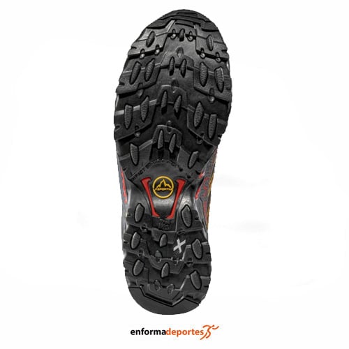 Zapatilla hombre LA SPORTIVA ULTRA RAPTOR II GTX, parte superior transpirable e impermeable gracias a la membrana Gore Tex® Extended Comfort, con cuello suave y cómodo para proteger el tobillo de la entrada de piedras o barro, con tiras de refuerzo de microfibra con capa antifricción, para mayor durabilidad, plantilla Ortholite Mountain Running y entresuela Memlex Eva para una amortiguación óptima y mayor comodidad y suela fabricada de un compuesto altamente resistente a la abrasión, sistema de frenos de impacto y punta de goma integrada resistente a los golpes.