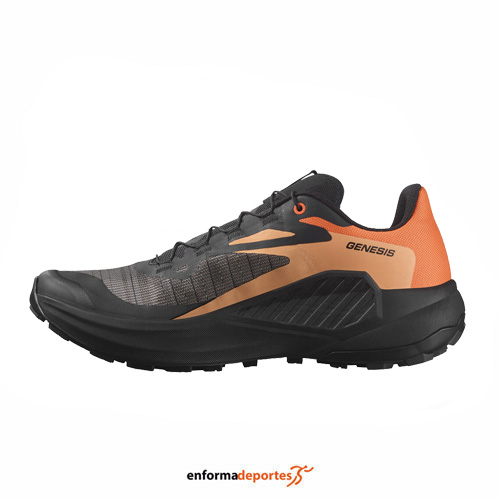 Zapatilla hombre SALOMON GENESIS, confeccionada en su parte superior Matryx con hilos tejidos que garantiza una transpirabilidad constante y una resistencia superior, con entresuela acolchada y reactiva de Eergy Foam que, suela con tacos de orientación invertida de 4,5 mm en compuesto All Terrain Contagrip que proporciona un agarre increíblemente fiable tanto cuesta arriba como cuesta abajo, con lengüeta ligeramente acolchada, ancha e integrada en la estructura, con dispositivo para ocultar los cordones evitando que se muevan mientras corres, con sistema de cordones rápidos Quicklace, con inserción más resistente en la puntera que protege de impactos y abrasiones y plantilla interna Ortholite, moldeada y extraíble.