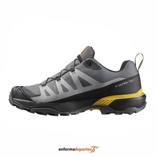 Zapatilla hombre SALOMON X ULTRA 360 GTX, fabricada con membrana Gore-Tex, parte superior de material sintético, con chasis Advanced Chassis™ es un inserto moldeado integrado en la suela. Ofrece una sujeción lateral potente y una protección segura, además de una movilidad y flexibilidad óptimas, con entresuela EnergyCell™, espuma de EVA de alto rendimiento que amortigua los impactos, con bolsillo para cordones, sistema de cierre Quicklace™, puntera protectora, tecnología SensiFit™ envuelve el pie desde la entresuela hasta el sistema de cordones, lo que proporciona un ajuste seguro, cómodo y prácticamente personalizable alrededor de todo el sistema, con forro interior textil que proporciona transpirabilidad y comodidad y con plantilla OrthoLite® ofrece una amortiguación, transpirabilidad y durabilidad superiores a fin de mejorar la comodidad y el rendimiento de tu calzado y suela All Terrain Contagrip®: Nuestro All Terrain Contagrip® está diseñado para la más amplia variedad de superficies. Ofrece durabilidad y confianza sobre superficies húmedas, secas, duras o resbaladizas.