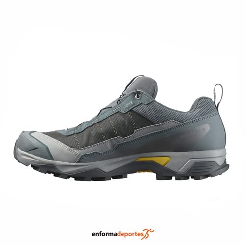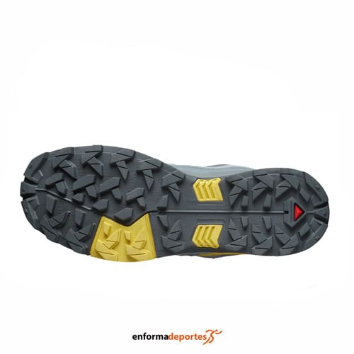 Zapatilla hombre SALOMON X ULTRA 5 GTX, fabricada en su parte superior malla Matryx ultraduradera, de amortiguación duradera, membrana Gore-Tex, mayor transpirabilidad, entresuela EnergyCell, de construcción de pala SensiFit y forro interior OrthoLite moldeado, con suela Contagrip All Terrain para una mayor tracción y durabilidad, y una zona del cuello adaptada para una comodidad duradera, cierre con cordones Quicklace y drop 11 mm.