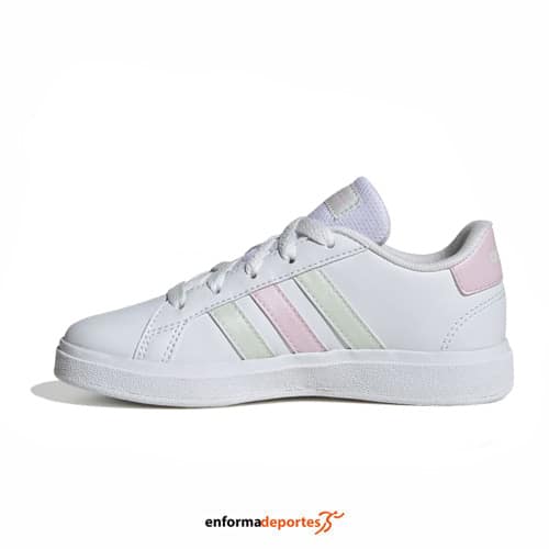 Zapatilla junior ADIDAS GRAND COURT 2.0 K, confeccionada en su parte superior de piel sintética, para mayor durabilidad, con forro textil, cierre con cordones para un ajuste personalizado y suela de goma para mayor agarre.