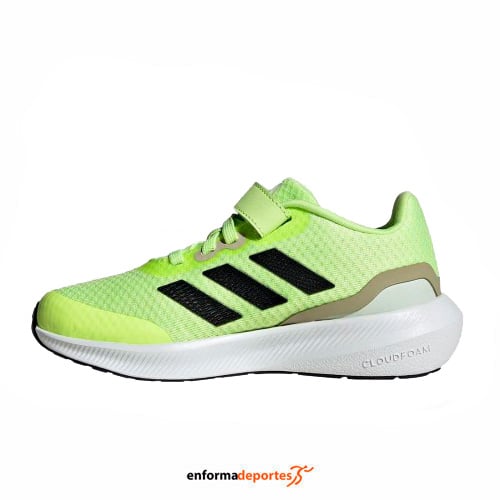 Zapatilla junior ADIDAS RUNFALCON 3.0 EL K, confeccionada en su parte superior textil, con refuerzos en puntera, talón, etc. de horma clásica, mediasuela de EVA, forro textil, suela de goma y cierre con cordones elásticos y velcro.