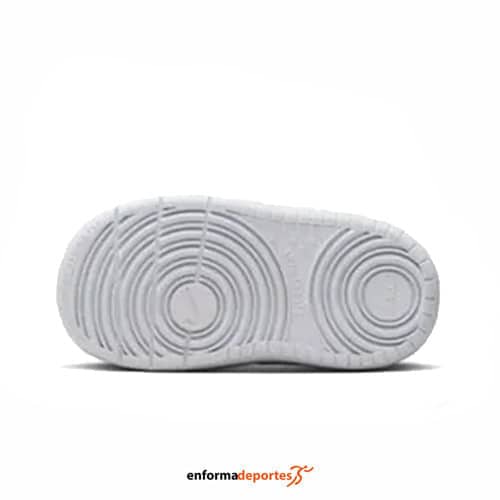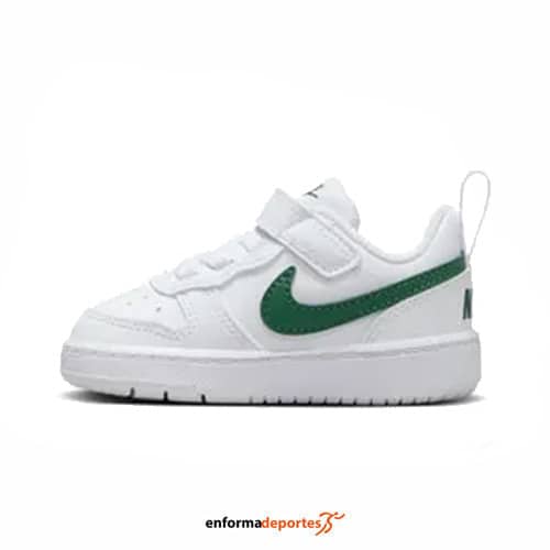 Zapatilla infantil NIKE COURT BOROUGH LOW RECRAFT, confeccionada en su parte superior y la suela exterior con costura doble, con puntera rediseñada, con cordones elásticos y cierre con correa de velcro.