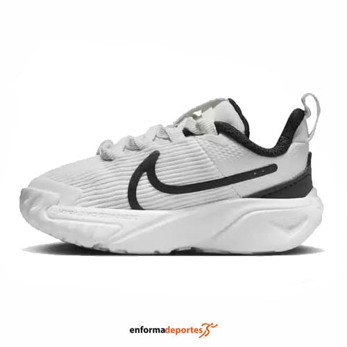 Zapatilla infantil NIKE STAR RUNNER 4, confeccionada en su parte superior de malla vertical para mayor frescura, con costura en la lengüeta que amplía la abertura para ponérselas y quitárselas fácilmente, sistema articulado en el talón para deslizar los pies fácilmente, talón a juego con la puntera para ofrecer puntos de contacto codificados por color, con inserciones de piel sintética resistente.