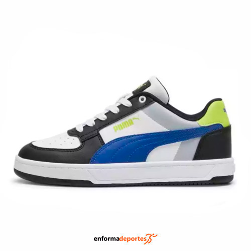 Zapatilla junior PUMA CAVEN 2.0 BLOCK, fabricadas en su parte exterior de material sintético de materiales reciclados, con plantilla SOFTFOAM+, plantilla de confort que proporciona suave amortiguación gracias al talón extragrueso, entresuela y suela de goma.