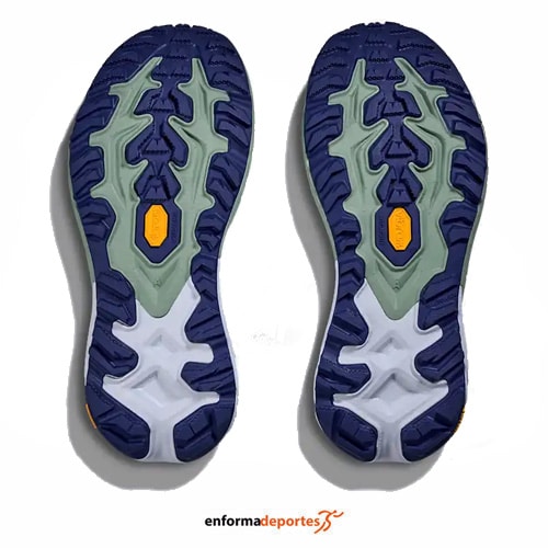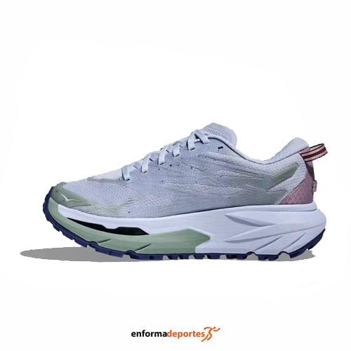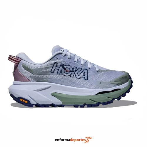 Zapatilla mujer HOKA MAFATE 5, fabricada en su parte superior con upper de malla jacquard transpirable de una sola capa y resistente a la abrasión, con mediasuela con tecnología PROFLY™ de doble densidad, que equilibra la suavidad en el aterrizaje con la reactividad en el despegue, con espuma EVA, más suave y reactiva, con capa inferior de EVA moldeada que aporta estabilidad y protección, con chasis Active Foot Frame™ que envuelve el pie por los laterales, lo que mejora la estabilidad en terrenos irregulares y suela con compuesto Vibram® Megagrip con tacos de 5 mm para garantizar tracción en todo tipo de superficies, con tecnología Meta-Rocker, diseño de suela curvado para facilitar una transición fluida del talón a la puntera.