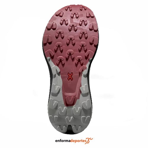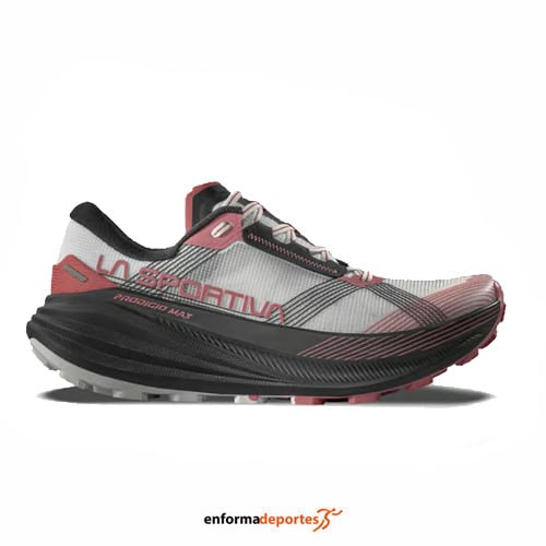 Zapatilla mujer LA SPORTIVA PRODIGIO MAX, fabricado en parte superior Comfort Wire con tejido Light TPU que proporcionan un ajuste firme y cómodo, incorporan la tecnología XFlow Endurance, que mejora la resistencia y durabilidad del material amortiguador, manteniendo la comodidad,  máxima amortiguación y comodidad, alta protección y estabilidad en terrenos variables gracias a la suela con gran superficie de apoyo y rocker medio,  combinada con una suela bi-compuesto Frixion Red que equilibra durabilidad en zonas de mayor desgaste y máximo agarre en la parte media delantera.