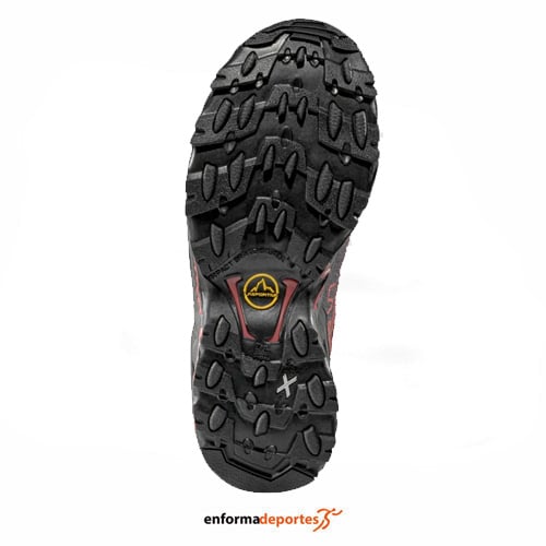 Zapatilla mujer LA SPORTIVA ULTRA RAPTOR II GTX, parte superior transpirable e impermeable gracias a la membrana Gore Tex® Extended Comfort, con cuello suave y cómodo para proteger el tobillo de la entrada de piedras o barro, con tiras de refuerzo de microfibra con capa antifricción, para mayor durabilidad, plantilla Ortholite Mountain Running y entresuela Memlex Eva para una amortiguación óptima y mayor comodidad y suela fabricada de un compuesto altamente resistente a la abrasión, sistema de frenos de impacto y punta de goma integrada resistente a los golpes.