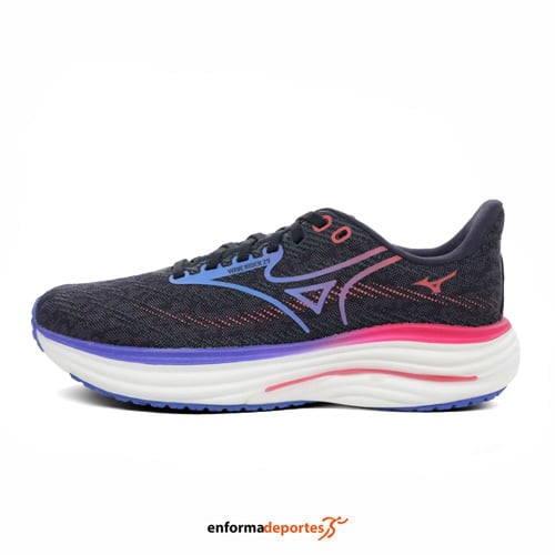 Zapatilla mujer MIZUNO WAVE RIDER 29, ideal para la práctica de running en asfalto, confeccionada en tejido y material reciclado, con mediasuela Enerzy NXT infusionada con nitrógeno, que ofrece una pisada más suave, reactiva y fluida, con grosor de mediasuela incrementado en +2 mm, placa Wave vegetal hecha con Elastollan® N (a base de biomasa) y drop 10mm.