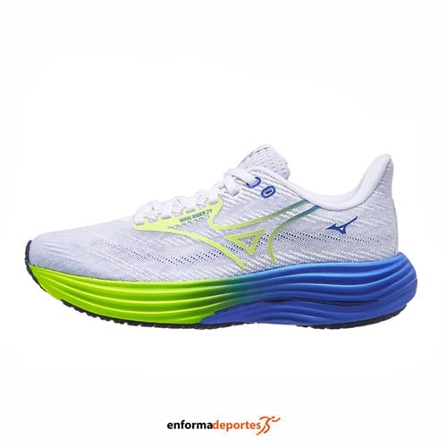 Zapatilla mujer MIZUNO WAVE RIDER 29, ideal para la práctica de running en asfalto, confeccionada en tejido y material reciclado, con mediasuela Enerzy NXT infusionada con nitrógeno, que ofrece una pisada más suave, reactiva y fluida, con grosor de mediasuela incrementado en +2 mm, placa Wave vegetal hecha con Elastollan® N (a base de biomasa) y drop 10mm.
