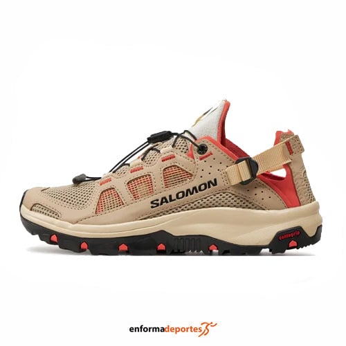 Zapatilla mujer SALOMON TECHAMPHIBIAN 5, confeccionada en su parte superior de material de secado rápido y transpirable, con puntera reforzada y una construcción completamente cosida para una máxima protección del pie, con malla protectora, con cierre con cordones Quicklace, con suela water Contagrip FD con ranuras planas y delgadas, en un compuesto de alta durabilidad y está diseñado para demostrar adherencia en todas las superficies y con tacón plegable.
