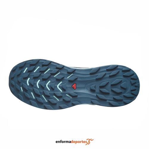Zapatilla mujer SALOMON ULTRA FLOW GTX, ideal para la práctica de trailrunning, fabricada en su parte superior de uper de malla transpirable y cómoda con refuerzos termosellados, con membrana impermeable Gore-Tex para mantener los pies secos, con entresuela con tecnología Energy Surge que maximiza el retorno de energía y las transiciones suaves, collar del tobillo y lengüeta muy suaves y acolchados para evitar posibles rozaduras y suela Contagrip diseñada para todo tipo de superficies con surcos que mejoran la flexión en cada zancada.