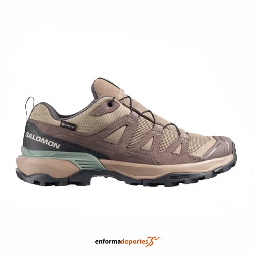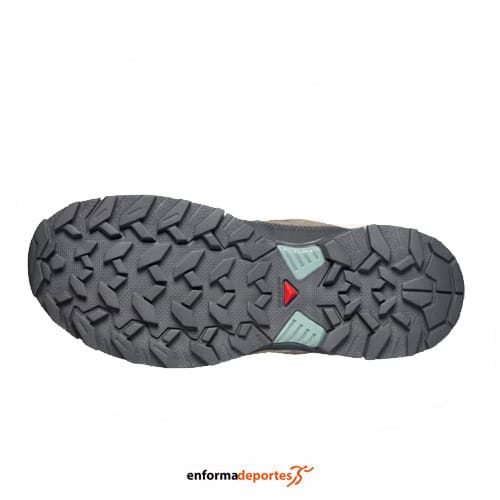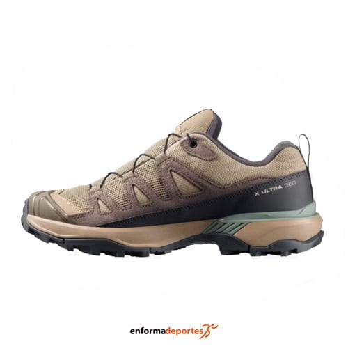 Zapatilla mujer Salomon X Ultra 360 Ltr Gtx, fabricada en su parte superior de piel de nobuk de alta calidad para una mayor resistencia y durabilidad, con pala sintética que garantiza gran resistencia y protección para las actividades al aire libre, con puntera protectora, con sistema de cierre con cordones quickLACE™, resistentes y minimalistas, con bolsillo para cordones; con sistema advanced Chassis™, inserto moldeado integrado en la suela que ofrece una sujeción lateral potente y una protección segura, con plantilla forro interior de OrthoLite® moldeada que se adapta al contorno del pie, y ofrece una amortiguación, transpirabilidad y durabilidad, con entresuela EnergyCell, espuma de EVA de alto rendimiento que amortigua los impactos y suela All Terrain contaGRIP®, que ofrece durabilidad y confianza sobre superficies húmedas, secas, duras o resbaladizas; con pala soldada sin costuras, con tecnología SensiFit™ que proporciona un ajuste seguro, cómodo y protección antibarro que es una envoltura de piel, material sintético o goma alrededor de la planta del pie que protege los laterales y los mediales del pie.