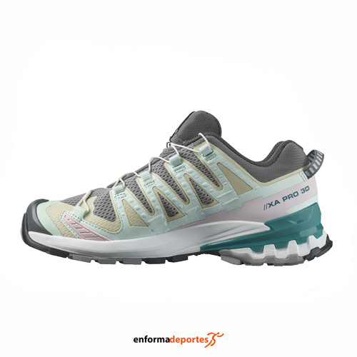 Zapatilla mujer SALOMON XA PRO 3D V9, confeccionada en su parte superior de malla 3D, con chasis avanzado de perfil bajo 3D, cuentan con una entresuela Energy Cell+ para retorno de energía y amortiguación a largo plazo, con plantilla EVA moldeada, suela All-Terrain Contagrip crea un agarre y una durabilidad insuperables.