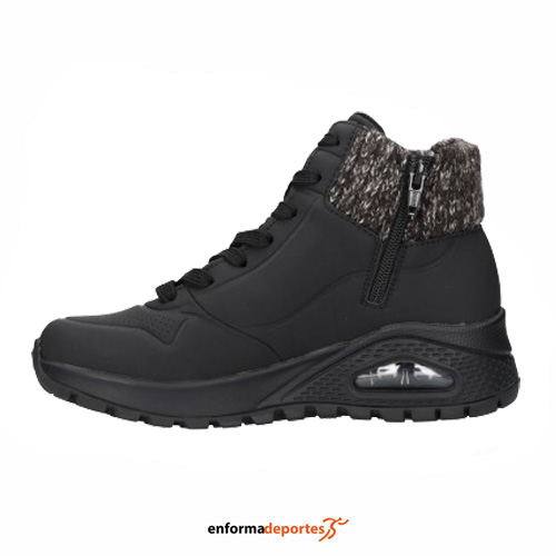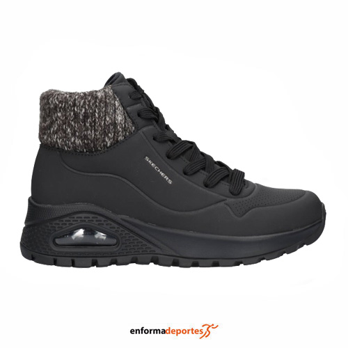 Zapatilla mujer SKECHERS UNO RUGGED, fabricada en su parte superior de piel durabuck perforado con cierre con cordones, con cómoda plantilla Skechers Air-Cooled Memory Foam®, media suela con cámara de aire visible Skech-Air®, con ribete de punto tipo jersey y cierre de cremallera lateral y suela flexible con tracción.