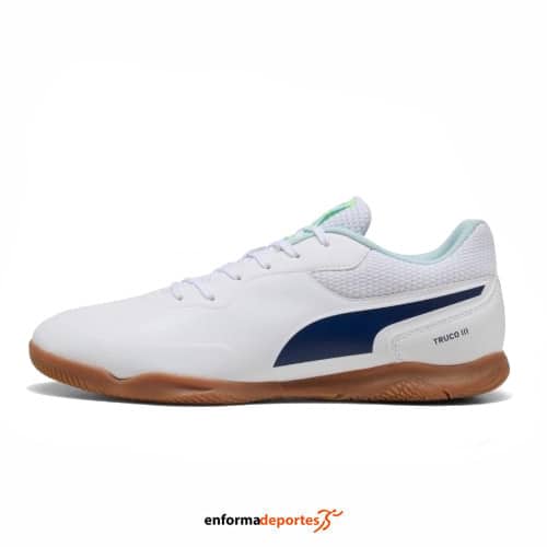 Zapatilla Unisex PUMA TRUCO III, ideal para jugadores que buscan comodidad, control y tracción en cada partido, ideal para práctica indoor, fabricadas en materiales sintéticos y malla para mayor durabilidad y transpirabilidad, con forro interior acolchado y lengüeta suave para un ajuste cómodo, con sistema de cierre de cordones que aporta estabilidad y suela de goma antideslizante, ideal para pistas de interior.