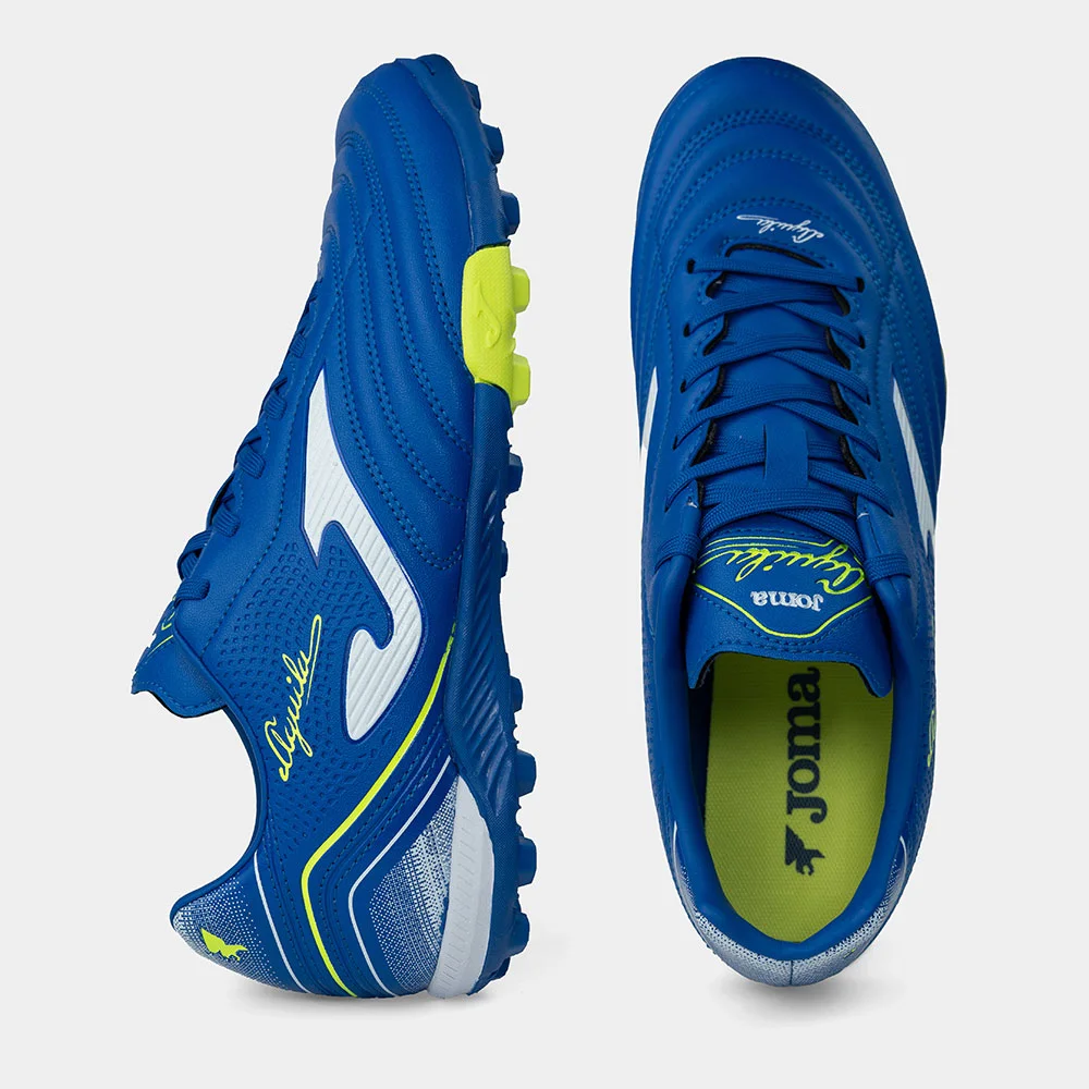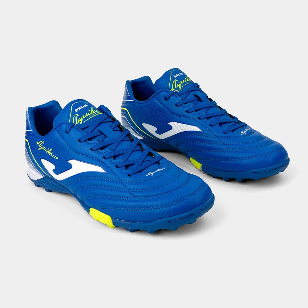 Las zapatillas de fútbol para hombre Joma Águila están diseñadas para césped sintético (turf) y son el aliado perfecto en la etapa de iniciación, permitiendo mejorar técnica, organización y precisión en el juego. Su upper de material sintético combina resistencia y ligereza, mientras que el contrafuerte EXO COUNTER en el talón proporciona firmeza y estabilidad en los cambios de dirección. La suela de caucho DURABILITY con estructura multitaco reduce la presión de la pisada, ofrece un excelente agarre y garantiza alta resistencia al desgaste por abrasión, brindando confort y seguridad en cada partido.