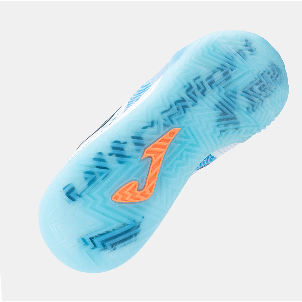 El upper de malla favorece la transpirabilidad y una correcta evacuación del sudor. El sistema de ajuste termosellado JOMA SPORTECH se adapta al pie sin añadir peso extra, garantizando una sujeción ligera. Este mismo material recubre la zona frontal, cumpliendo la función de tecnología PROTECTION y asegurando un contacto preciso con el balón.