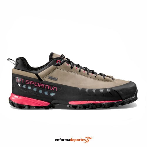 Zapato mujer LA SPORTIVA TX5 GTX, fabricada en su parte superior de piel nobuk de alta calidad suave y cómoda, estructurado y protector gracias a la plantilla estabilizadora que permite un uso prolongado, con sistema de cierre de cinta ligero y rápidobota de cuero está dedicada a los excursionistas que buscan un producto técnico para rutas de aproximación, huking y vías ferratas. Ligero y protector, TX5 Low GTX es impermeable y transpirable gracias a la membrana GORE-TEX.